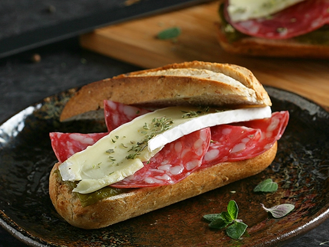 Montadito mit Salchichón, gebratener Paprika und Brie