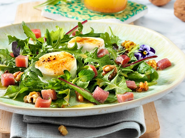 Wildkräutersalat mit gebackenem Ziegenkäse, Walnüssen und Serrano-Schinken